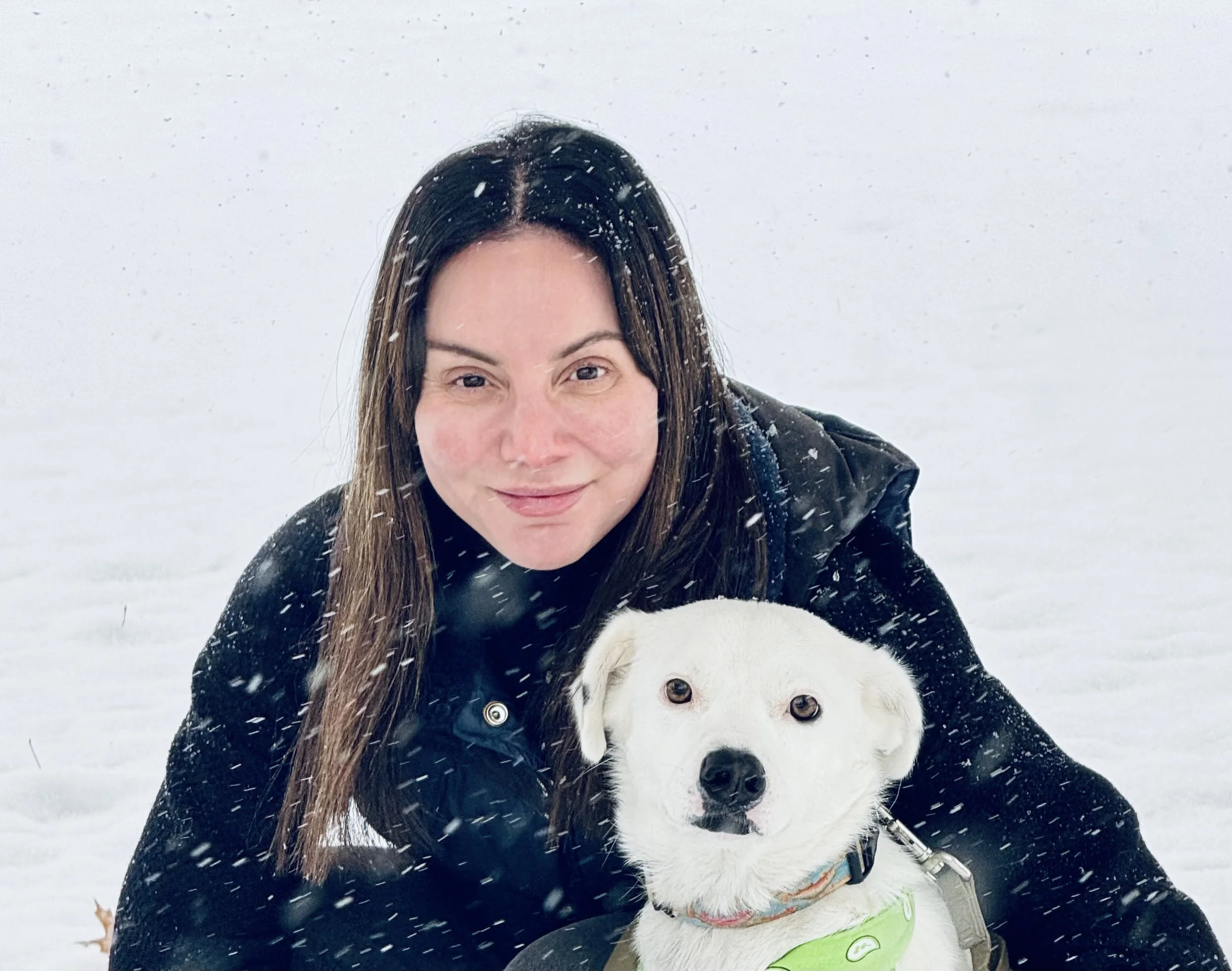 A woman with long brown hair and light skin, dressed in a black jacket, leaning in close beside a white dog in snowy weather with snow falling around them.